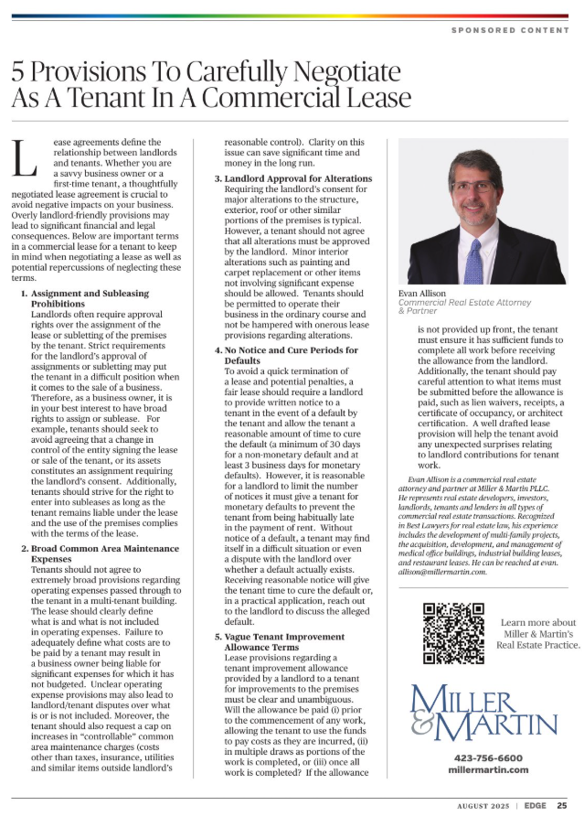 Miller & Martin commercial real estate attorney Evan Allison recently authored an article titled “Five Provisions to Carefully Negotiate as a Tenant in a Commercial Lease” for the August 2025 issue ofย EDGE Magazine (page 25). The article highlights five important terms in a commercial lease for a tenant to keep in mind when negotiating a lease as well as potential repercussions of neglecting these terms.
