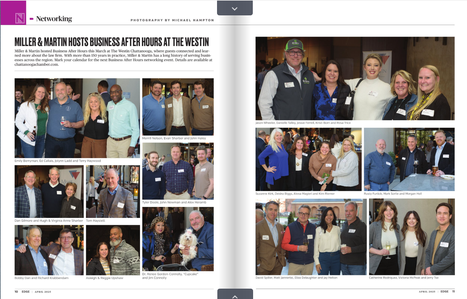 In coordination with the Chattanooga Area Chamber of Commerce, Miller & Martin hosted the March 2025 Business After Hours networking event at The Westin Chattanooga, where hundreds of guests connected and learned more about the law firm. With more than 150 years in practice, Miller & Martin has a long history of serving businesses across the region.ย