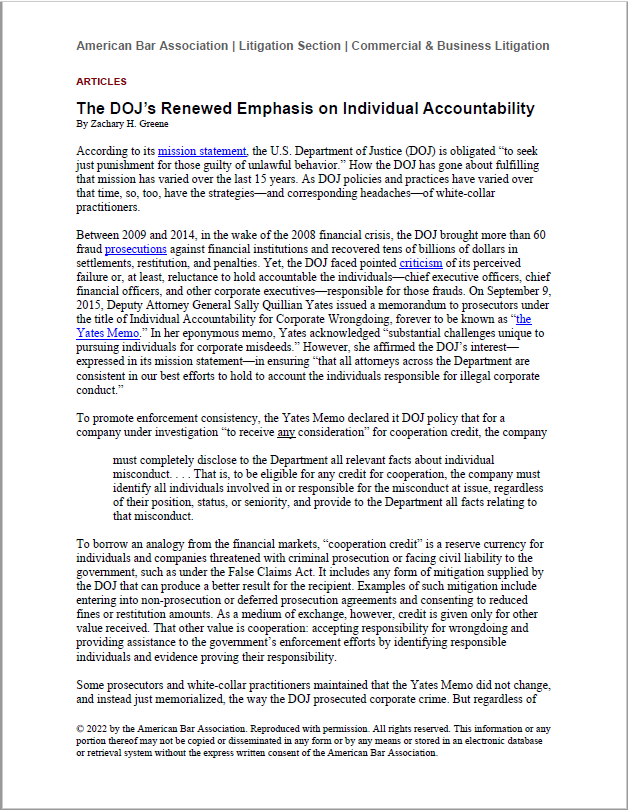 DOJ’s Renewed Emphasis on Individual Accountability Highlighted in ABA Article by Litigator Zac Greene