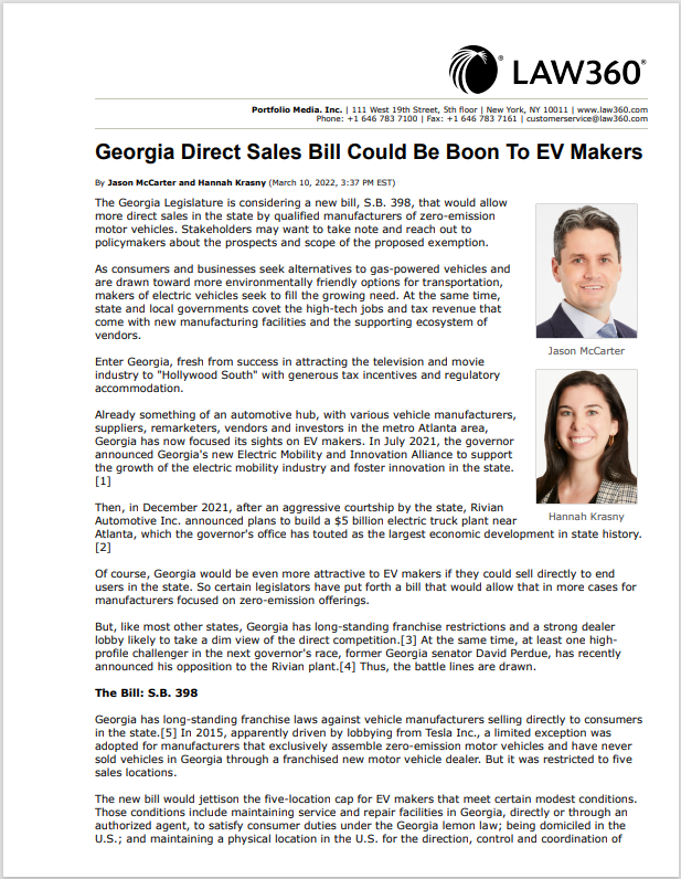 In the article published byย Law360, Miller & Martin attorney Jason McCarter and co-author discuss a new bill, S.B. 398, that is being considered by the Georgia Legislature that would allow more direct sales in the state by qualified manufacturers of zero-emission motor vehicles.ย